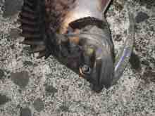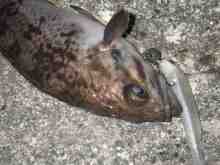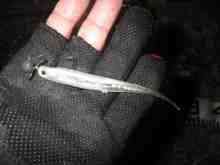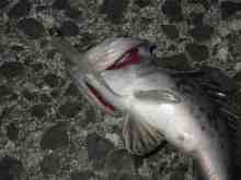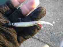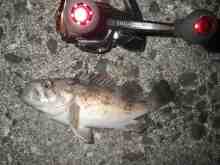 で明るいうちはベイトフィネスでアブちゃんでも狙おうと(和田さん曰く「アブラコはまだ水温低くてつれないよ」)デビルホッグでボトムを探りますが・・・ショートバイトばかりでフッキングはしてくれない。おまけにデビルホッグにつきものの「アーム食い千切り」もないと、こりゃホントに和田さんの言うとおりまだアブちゃん釣るには早いのかなと。