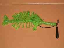 結構厚塗りして乾いた後セッティングを確かめてみました。Webでいろいろ調べてみたらフックは#2/0、直リグが良いというのでDECOYのゼロダンワーム217の#2/0 5gを組み合わせてみました。フックの先端が額を貫いて出てしまっていますがこれが正しいセッティングの様です。直リグスイミングで使うのなら問題はないのかな?