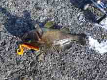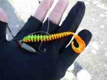 ポイントに着いたらすかさず、朝の定番、Gulp!パルスワームCGBFO、いわゆる基地外パルスで丹念に探ります。するとバイトはあるんですが、そのパパには、
