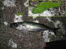 マサバ!それも結構いいサイズ!M氏自作のメタルバイブに1発目で乗ったとのこと。右上がそのメタルバイブの拡大像。自作メタルバイブでシーバス、チヌを仕留めている職人だけに流石!