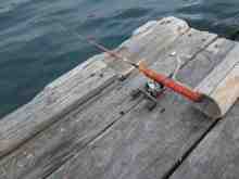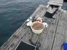 で、ロッドは短い筏専用竿、リールも筏専用竿で、釣り方は団子釣り(ネットで調べたら紀州釣り?)です。基本錘も何にもないフカセ仕掛けで餌の付いた鈎をコマセの団子で固めて底まで落とし、団子が割れて出てきた餌を咥えた魚をフッキングして釣る釣り方です。そのパパは初めての釣り方なので慣れるまで3時間は掛かりました。