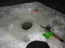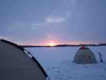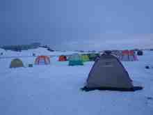 てなわけで、朝4時起きで眠い目をこすりながらやって来たのは佐藤水産駐車場。さすがにこの時間だと駐車場も空いていたので一等地に駐車しいざポイントへ。キャップライトで照らすとテントが5基。こりゃ好きな場所に入れるぞと急いで穴開けて、テント設営し、仕掛けにラビットを付けて投入したのが5:50。