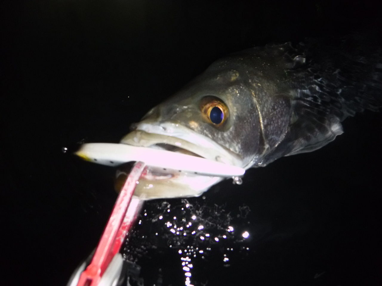 ポイントは常夜灯があり表浜名湖の強い流れがあります。下げ5分程度からのエントリーです。まずは定番のジップベイツSSM85で広範囲を狙ってみます!常夜灯の明かりが照らしている水面にルアーを通すイメージでキャストしリトリーブして行くと1投目からゴンっと当たります。この時期は啄むようなショートバイトが多いので、こっちがビックリしちゃう様な強い当たりでした。