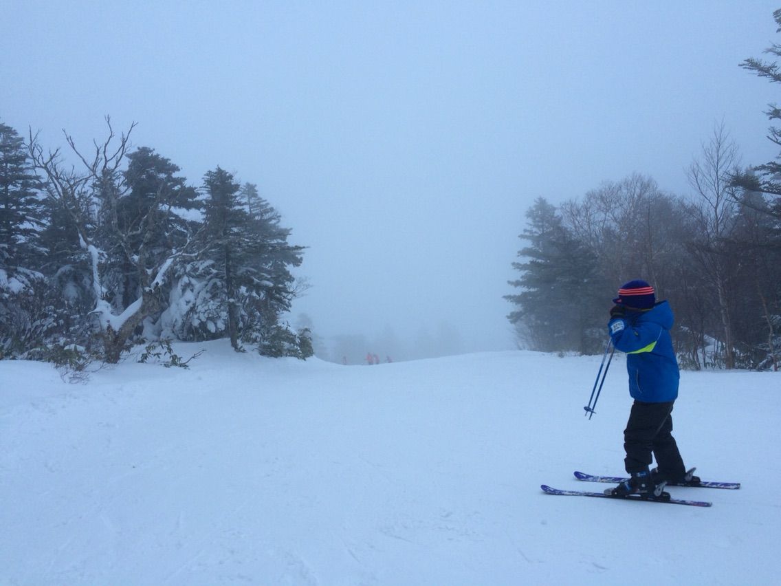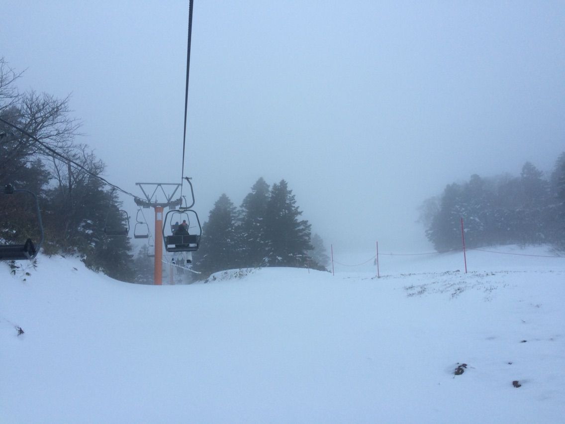 1本、ウォーミングアップで滑るとすぐに山頂行きのリフトに乗り、雲の中に突入!^o^
