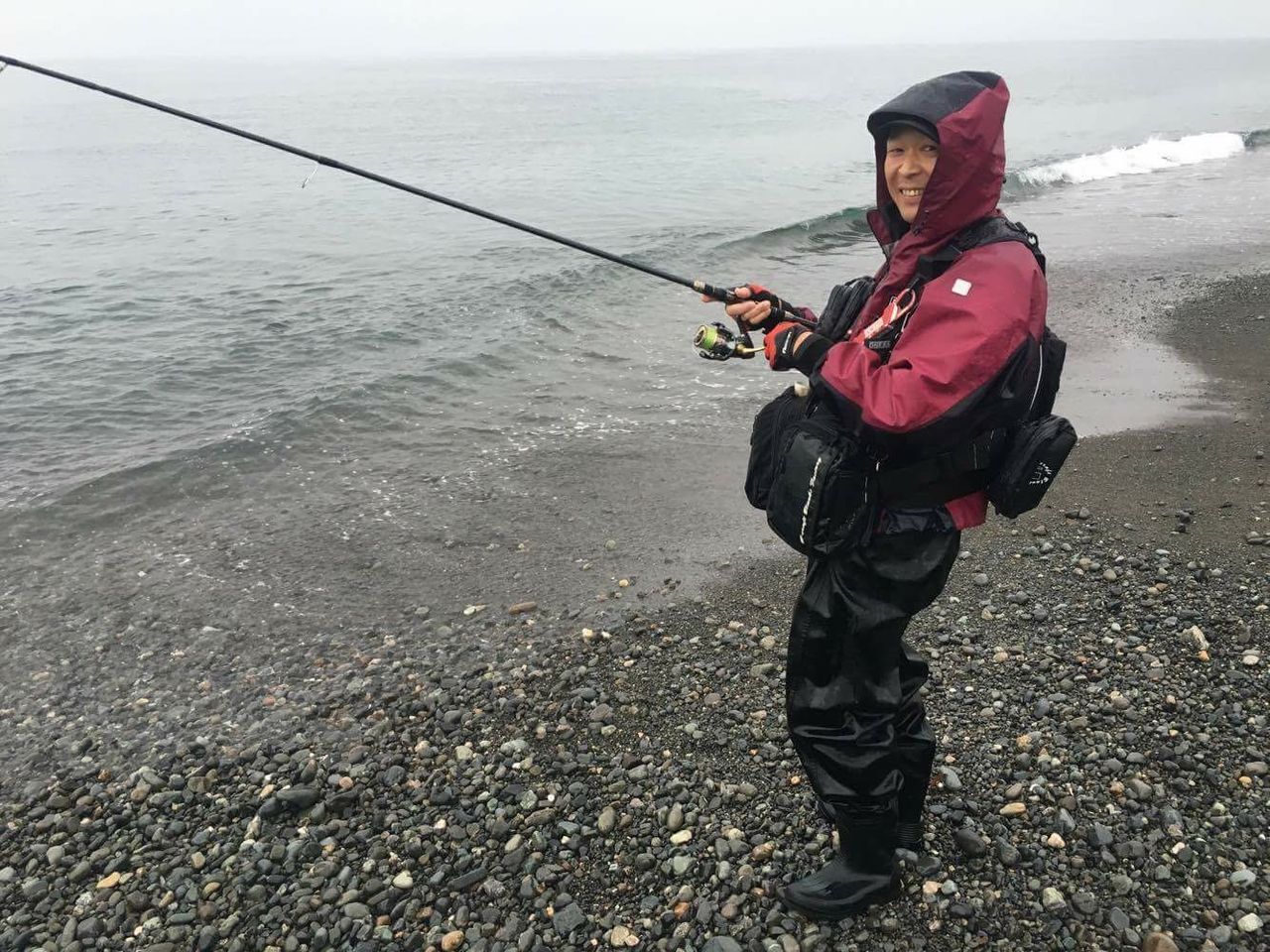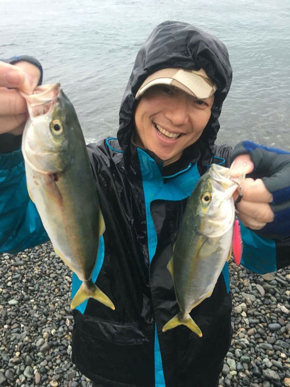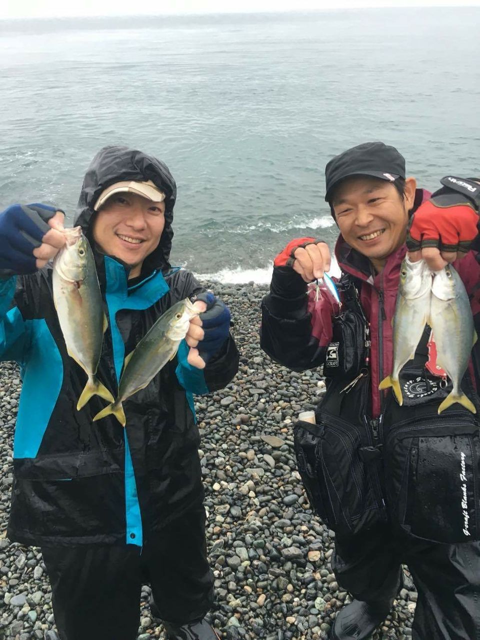 昨晩急遽思い立ったんですよ。雨の中1人で釣りしたくないなぁって。だから、誰かこんな豪雨の中一緒に釣りしてくれる人居ないかなぁって。そしたら駿河湾でようやく見つけたんです。バンジーショットモニターでご一緒させて頂いているたまおさんです!