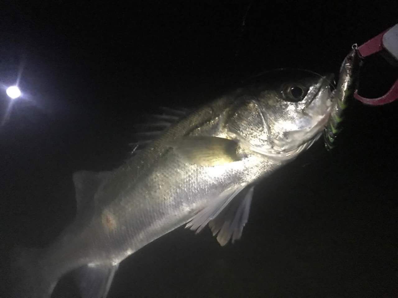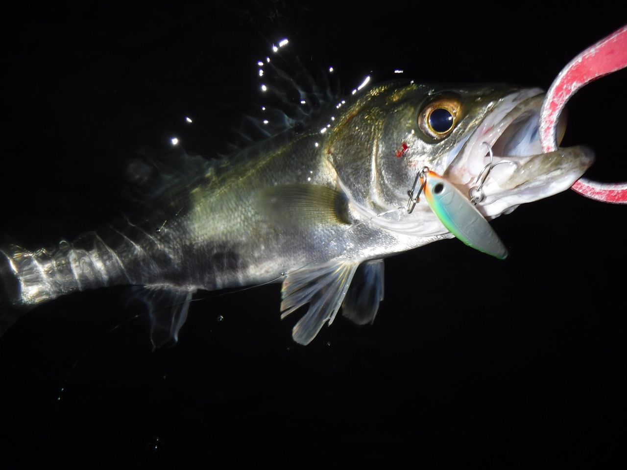 ボトム付近をスローで泳がせていたS.P.M75にバタバタっとシーバスがヒットしました。