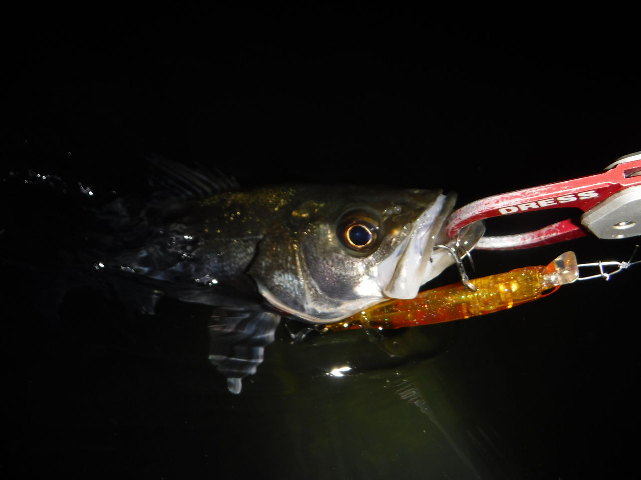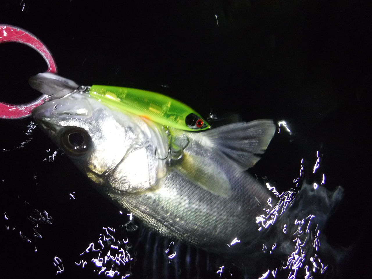 S.P.M90で探ってみると、確かにバイトはあるものの乗らない。もう少しスローに表層が引ける方が良さげ。という事で9Fタイダルでドリフトさせると乗った!手応えは小さそうだけど狙いは悪くない感じ。