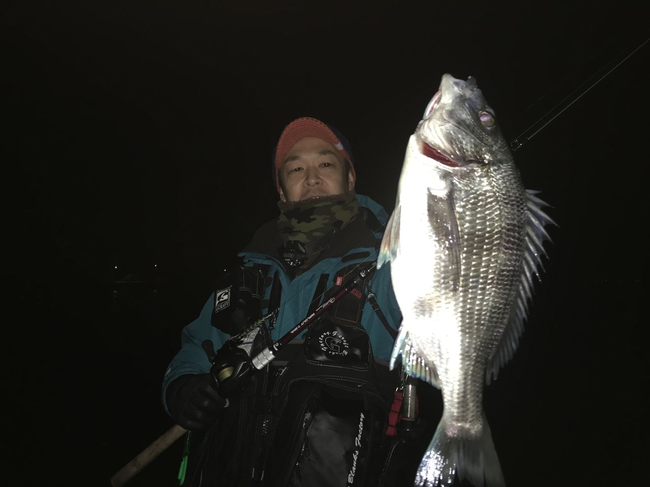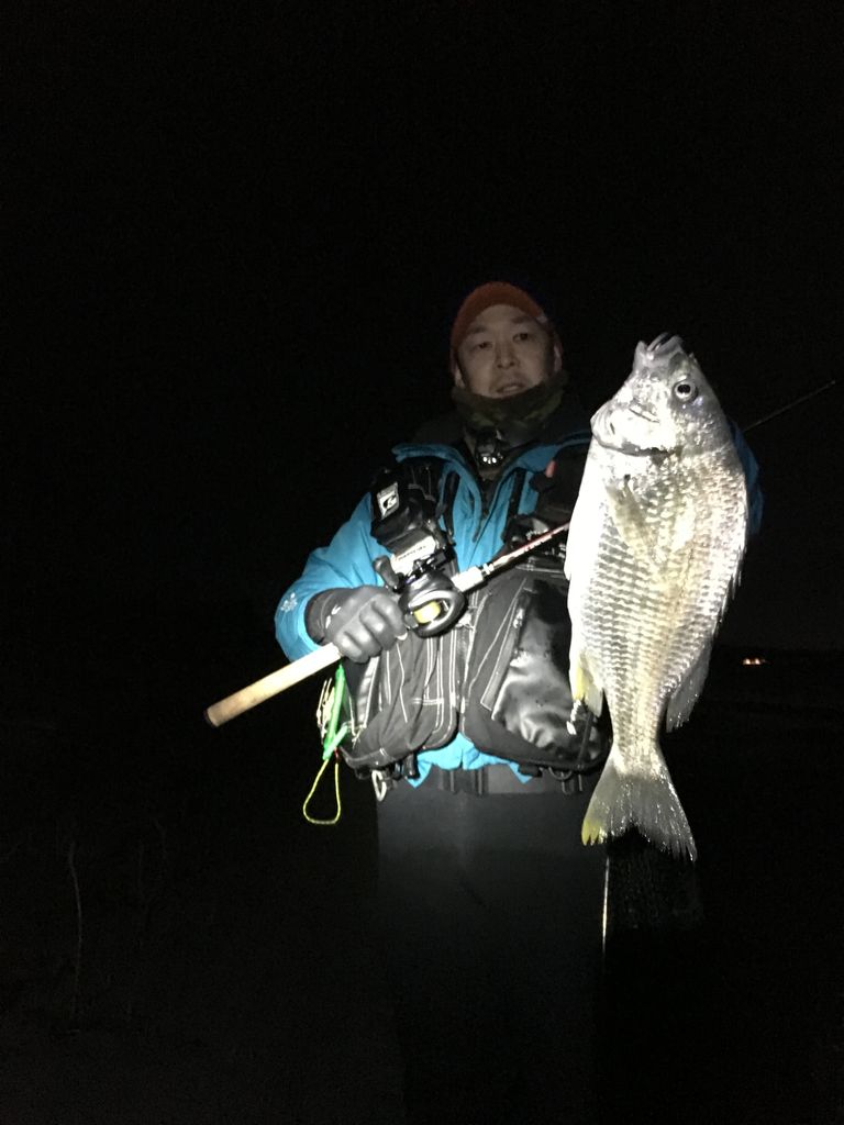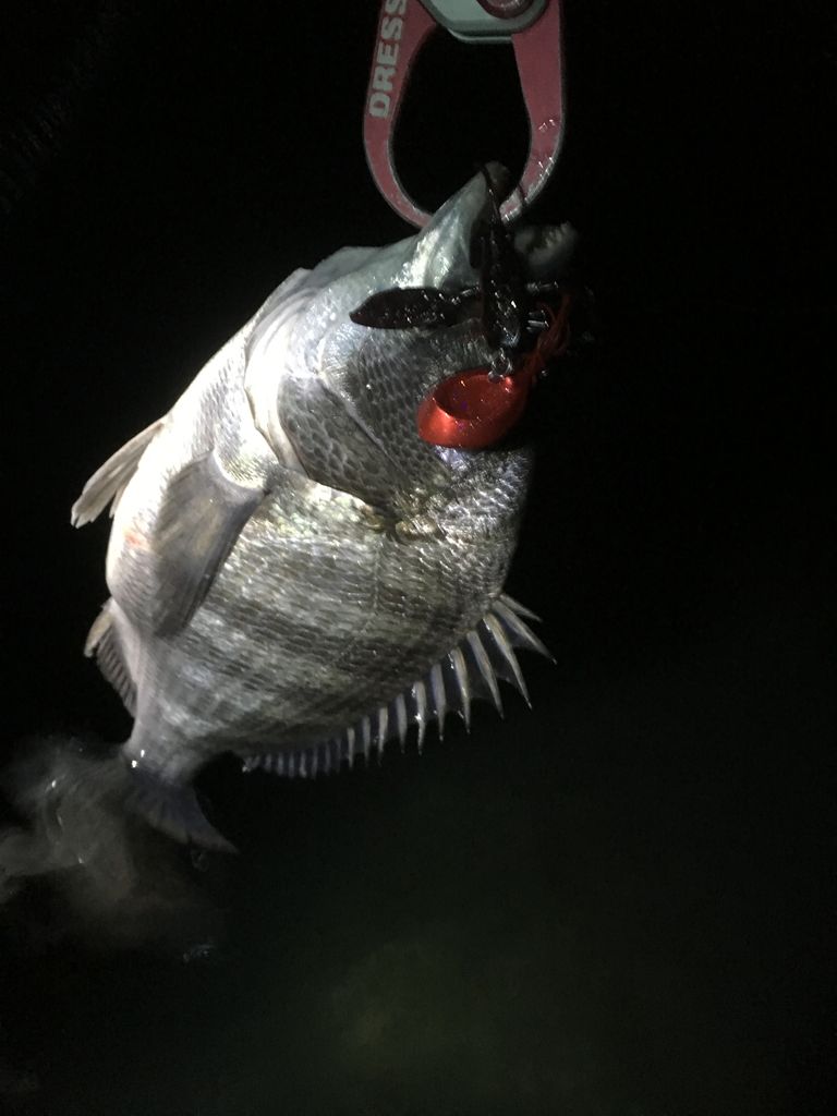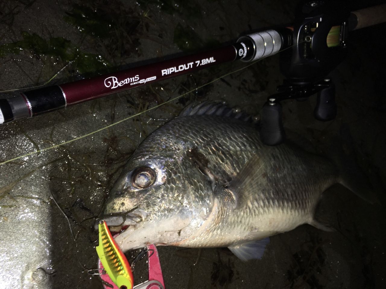 こちらはネガカリノタテ16gで遠投し、航路の深場のボトムを狙って釣ったクロダイ。