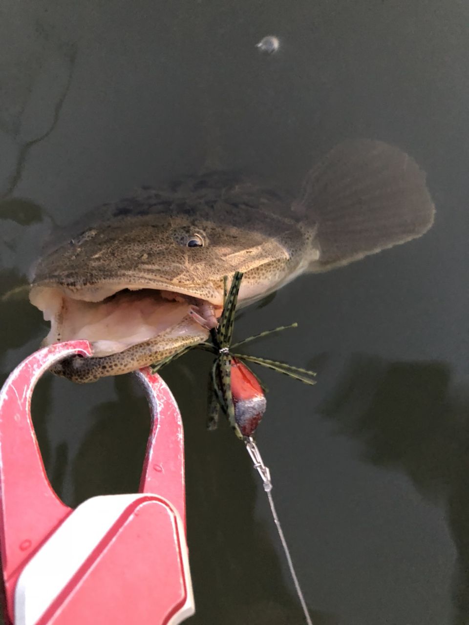 そして、そのボトムサーチ中にモゾッとバイト。合わせてみると、しっかりフッキングが決まりファイト開始。首を振る独特のファイトから上がってきたのはマゴチでした。