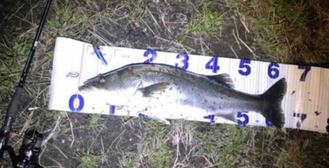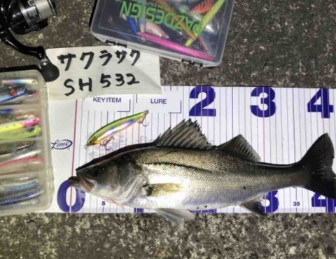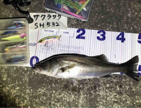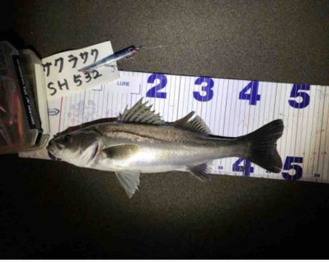 ラインがタワミ気味で流していたがしっかり解るアタリ。もっと大きいかと思ったがセイゴ、、